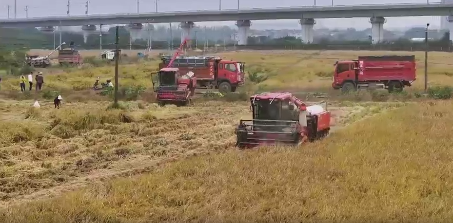在杭州余杭大街上湖村,6台收割机正在金黄的稻田里络绎。行进、撤退、转弯、收割……一串串丰满的稻穗卷进收割机中,秸秆从收割机尾部排出,稻谷尽收“囊中”。